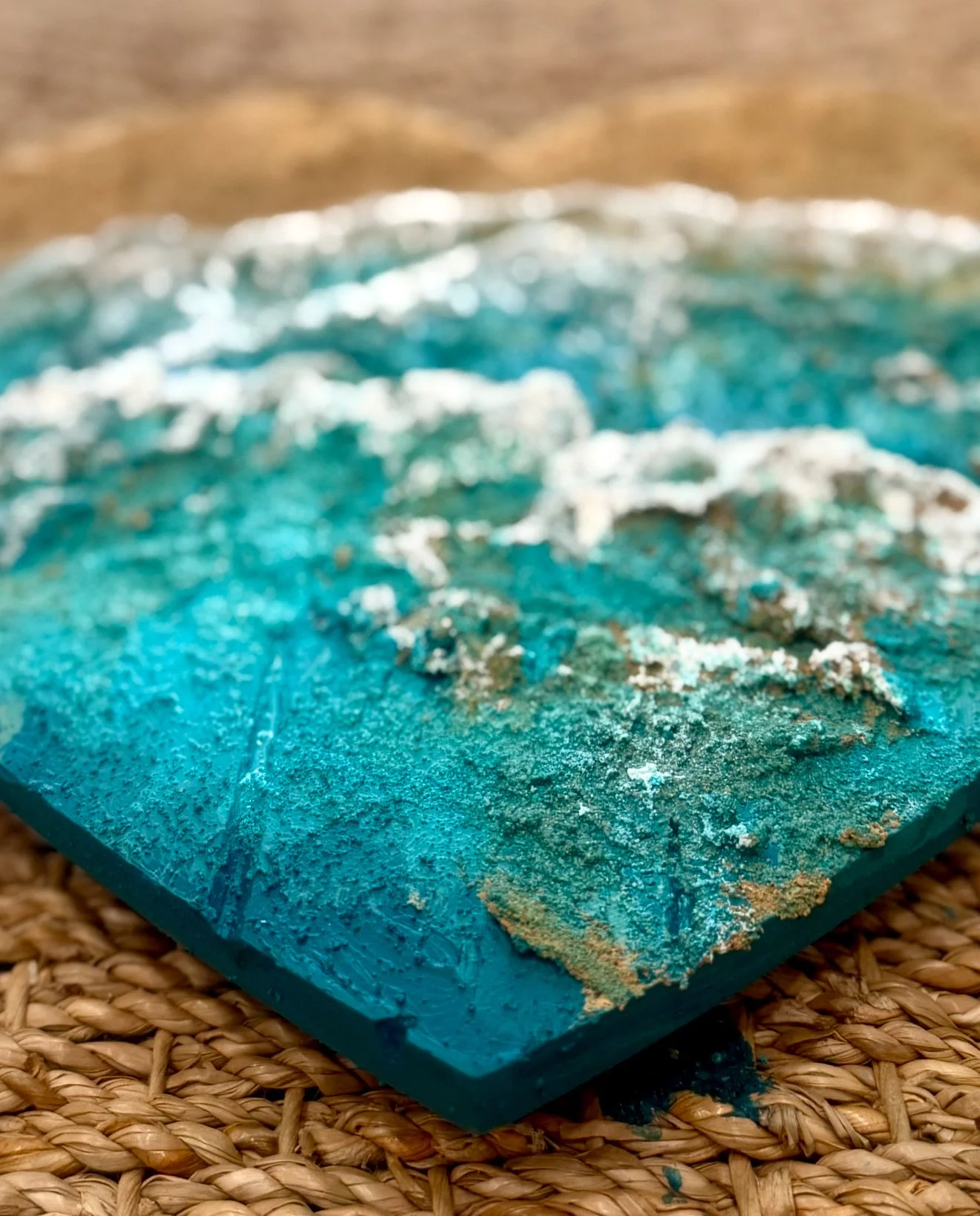 Under the studio Blue Crush Artist. Anna Finch shapes nature-inspired art that you can both see and feel: immersive 3D textured paintings using materials like sand and marble powder, handcrafting her own structural paint to create nature and ocean-scapes over wood, canvas, and glass.